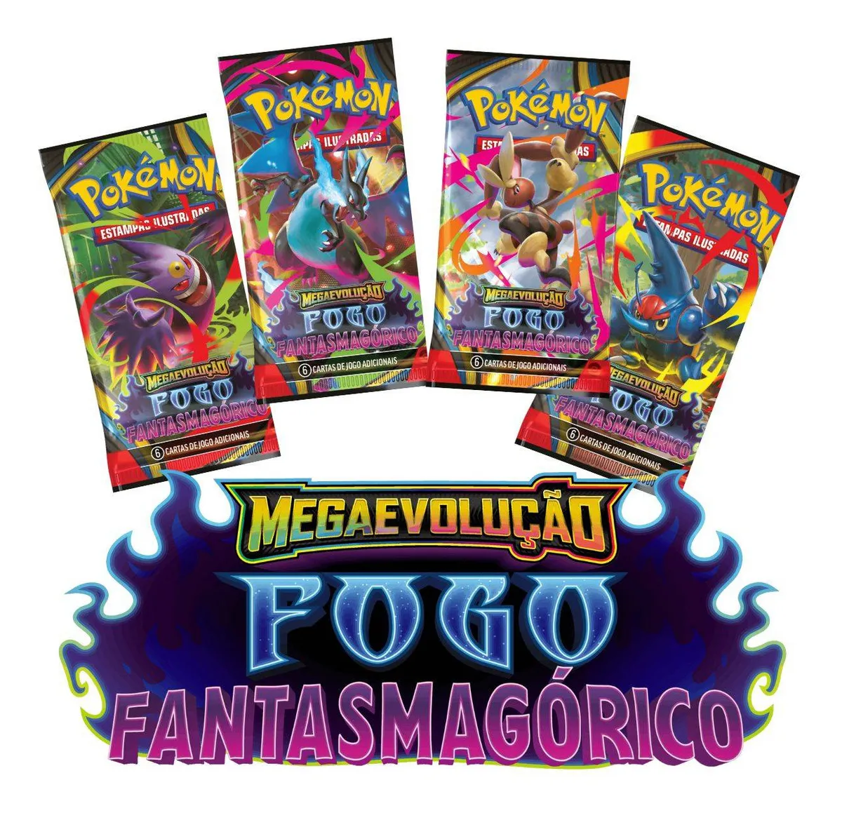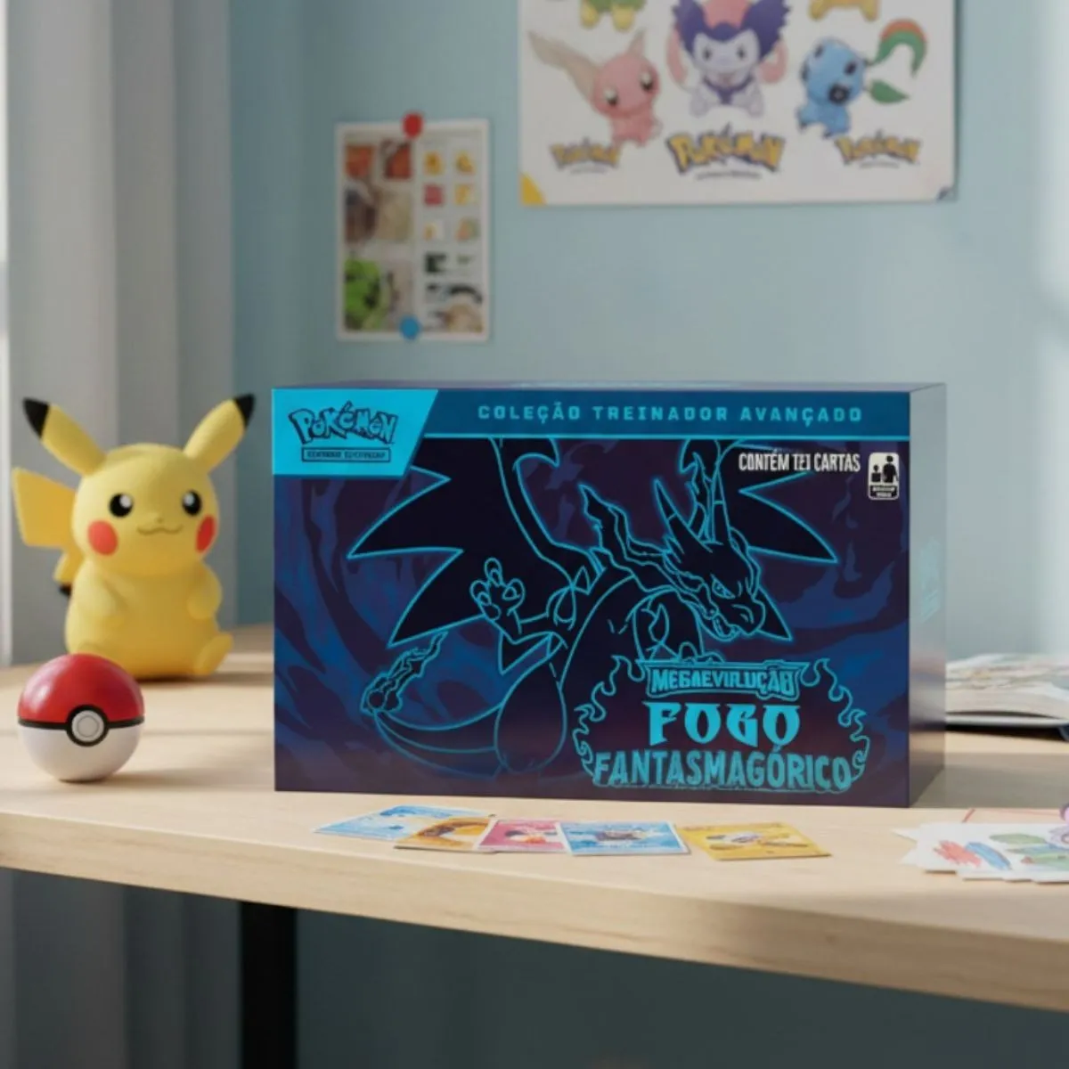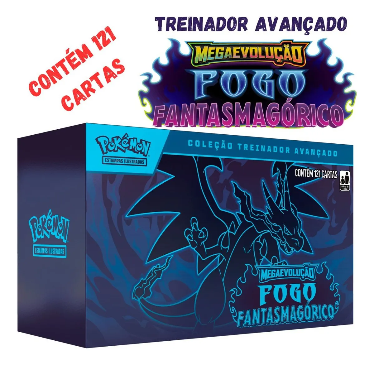 Box oficial Pokémon TCG com cartas da coleção Fogo Fantasmagórico.
