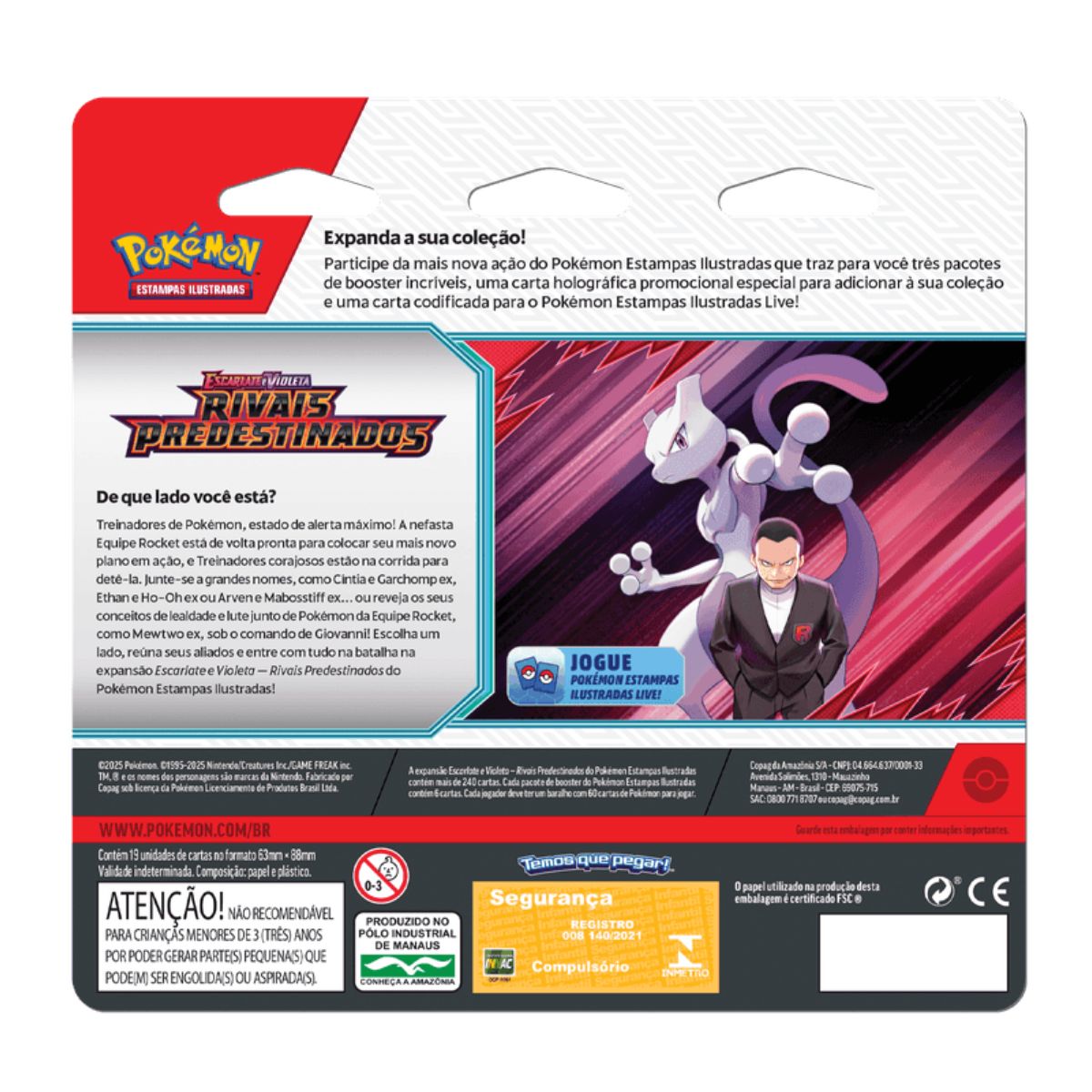 Está pronto para escolher um lado nesta batalha épica? O Blister Triplo EV10 – Rivais Predestinados traz 3 boosters da expansão Escarlate e Violeta – Rivais Predestinados, uma carta promocional holográfica exclusiva Kangaskhan.